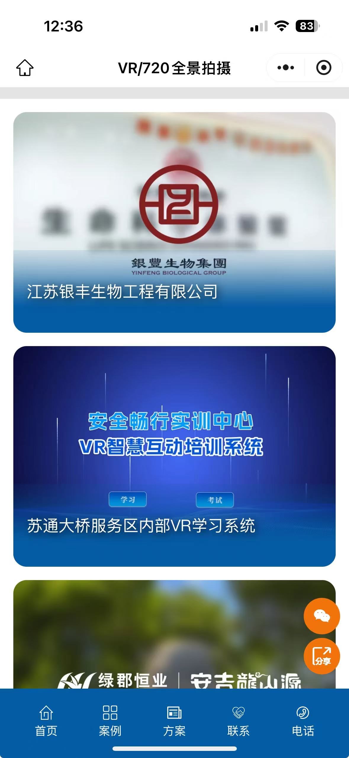 在这里我们以小程序的方法来展示VR全景案例,因为需要放在小程序里的网址都需要通过小程序验证,不验证的网线地址无法放在小程序里展示。所以在小程序里打开的案例可以100%确实是对方的案例。